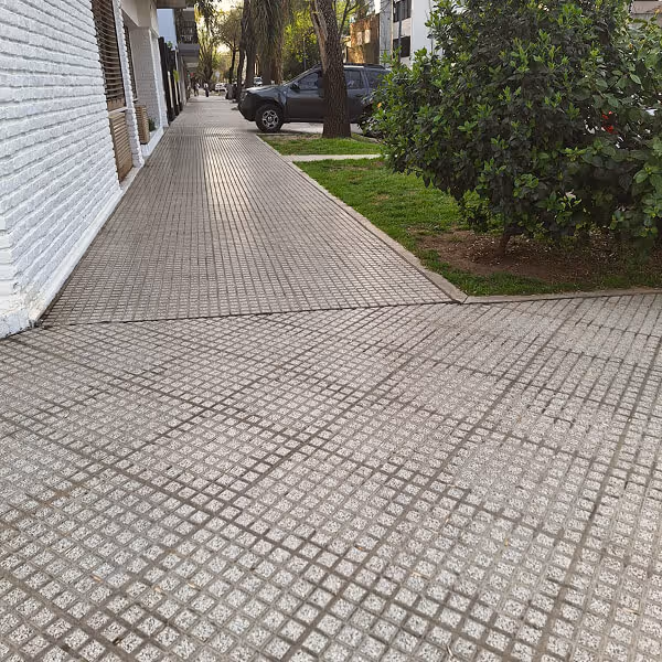 Para una vereda frontal se coloca usualmente baldosas en vez de “mosaico”, la diferencia esta en el bisel en los lados de la pieza. Suelen tener algun diseño que sirven para mejorar el drenaje del piso y aumentar su capacidad antideslizante. Lo más importante es que sea alto tránsito. Dubra detalla rutinas de curado y limpieza: por ejemplo, en calcáreos se recomienda un curado o hidrolaqueado y futuros mantenimientos con cera.